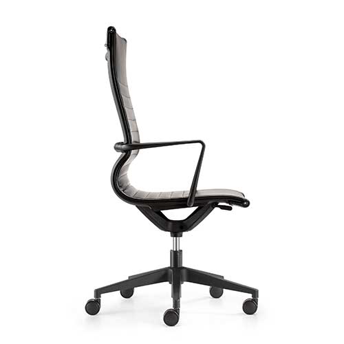 El asiento del sillón ejecutivo Bogotá respaldo alto está elaborado con espuma estándar tapizada en vinil. Brinda comodidad y estabilidad, adaptándose al cuerpo del usuario para ofrecer soporte continuo durante horas de trabajo.