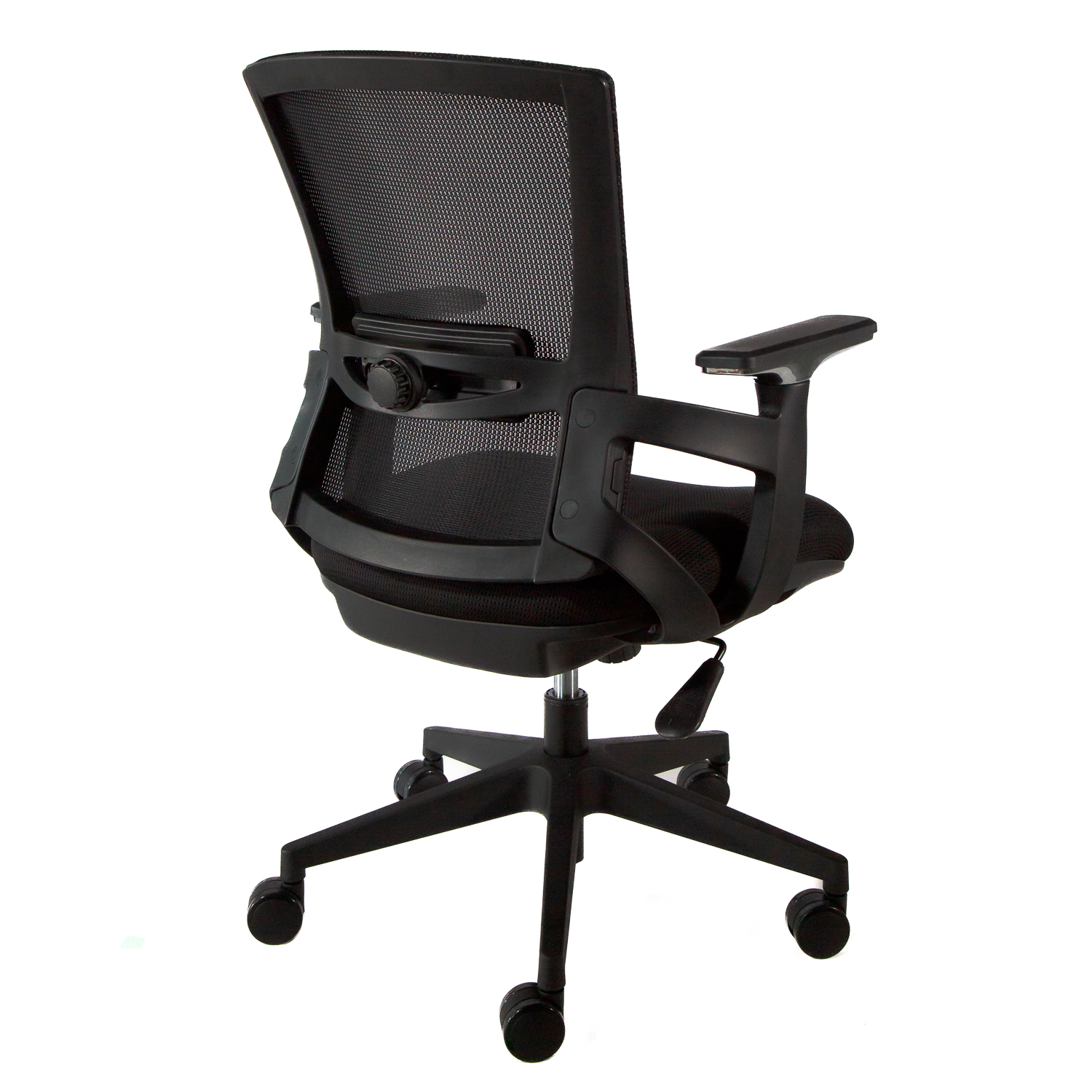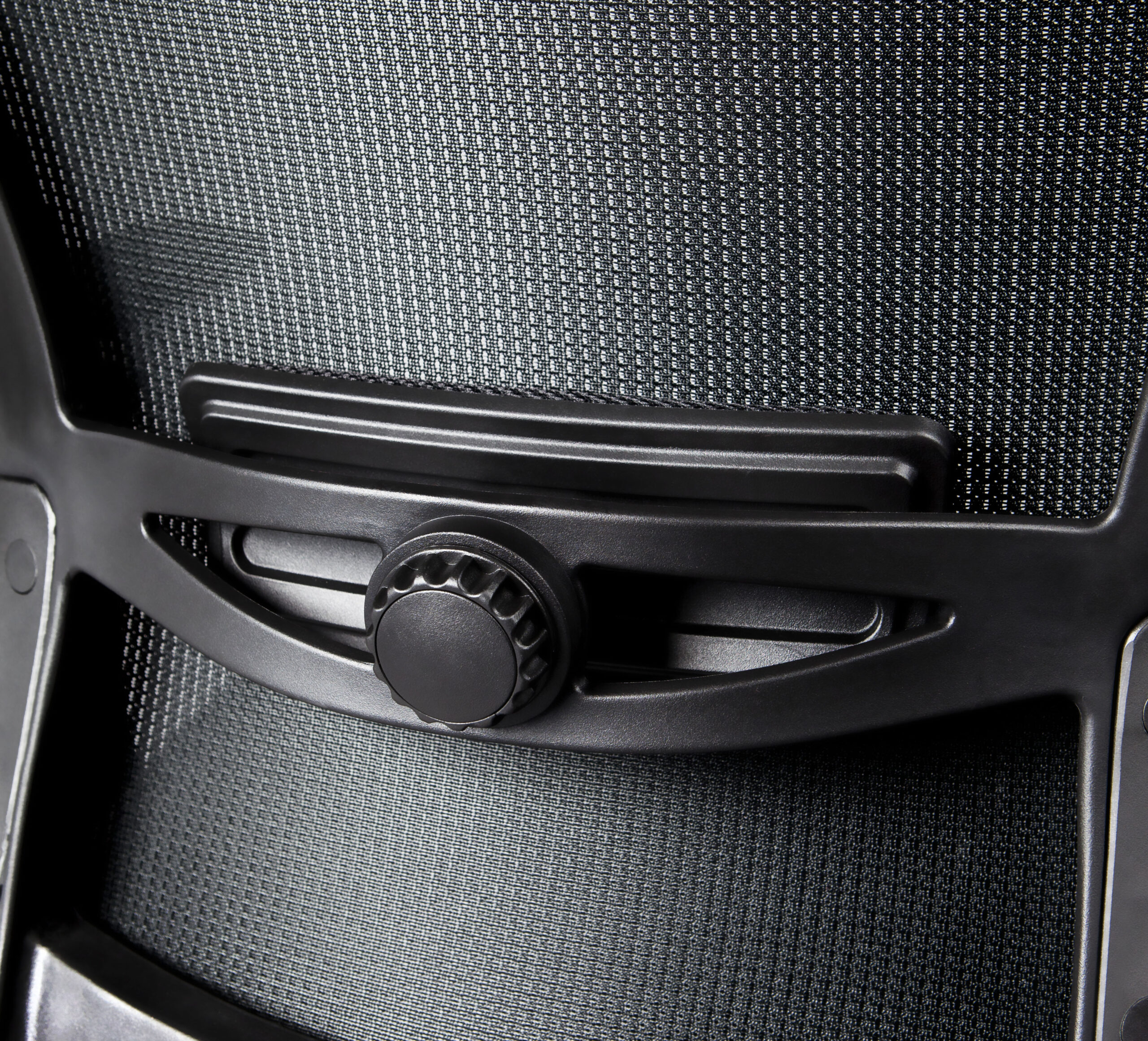 El soporte lumbar de polipropileno con espuma tapizado en malla cuenta con ajuste giratorio de profundidad, una característica única que permite personalizar el nivel de apoyo en la zona baja de la espalda.